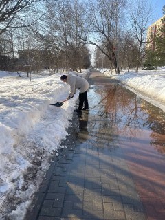 Бабушка в Домодедово самостоятельно расчистила тротуар на Аллее Славы, устранив большую лужу, мешающую прогулкам.