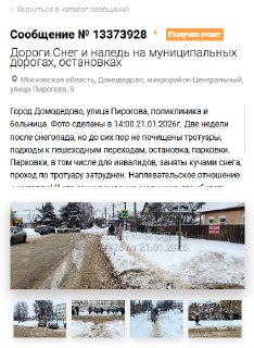 До этого приходили ответы, что обращение принято в работу и направлено исполнителю, назначен срок, 28.01. Написали, что почистят до 04.02, но 05.02 уведомили о просрочке исполнителем (администрацией г.о. Домодедово), а 14.03 прислали фотографии, что работы наконец-то выполнены. Чудо чудное, диво дивное! Оперативность наш конёк.